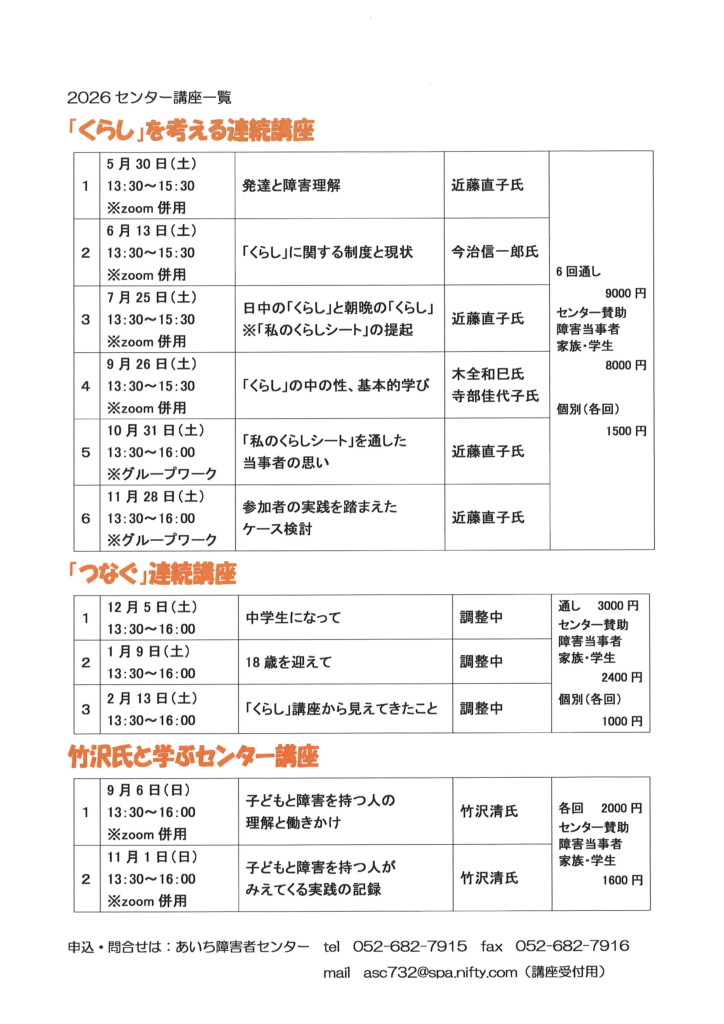 2026センター講座一覧 2026年4月24日 2026センター講座一覧表です。 予定を空けておいて下さいね~。 コロナ以降、オンラインも進み、人がつどい、語り合うことが減りました。 (センターの年寄りはついていけないけれど~) オンラインでつながることができても、共感できるのはリアルがよいに決まっている。 (と、センターの年寄りは思っている~) センターは、リアルでワイワイを目指します。 忙しい中での貴重な時間を、たくさんの人と共有したいので、2026年度講座は特別価格にて開催します。